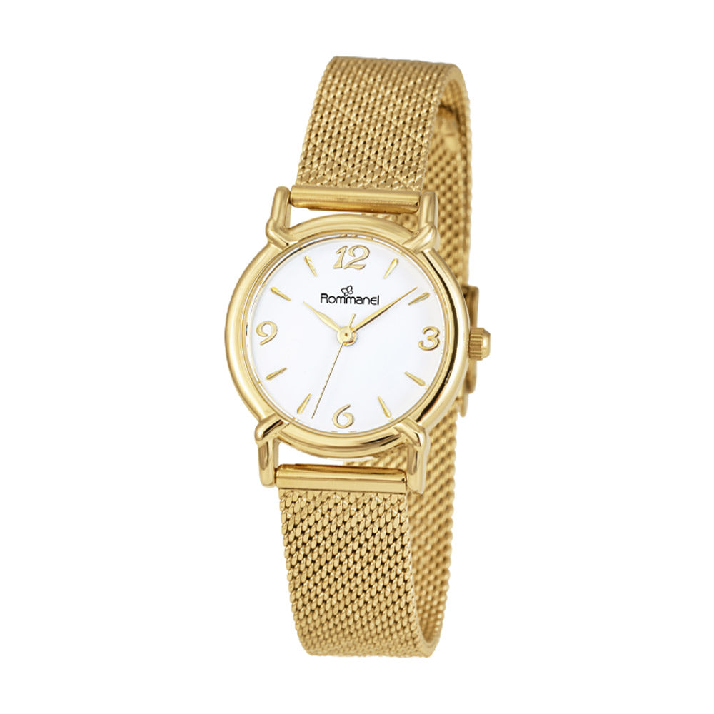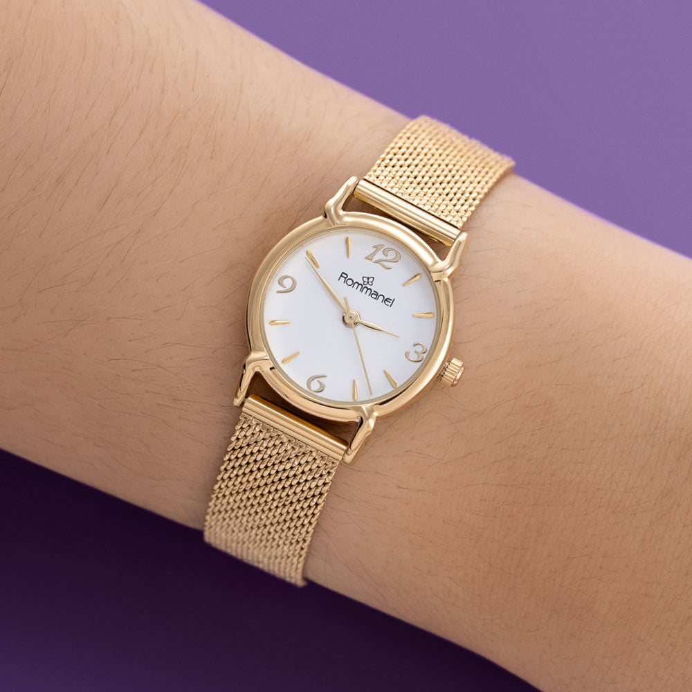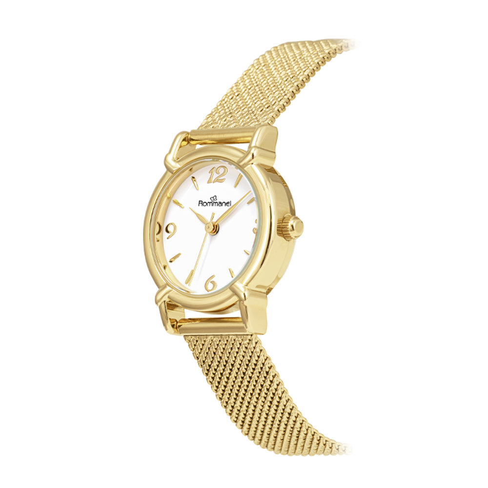 Relógio analógico social dourado, caixa redonda de metal, mostrador branco, números e ponteiros dourados, vidro mineral, pulseira de aço, fecho slide com trava de pressão, resistente a água.