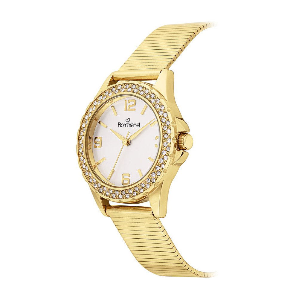 Relógio analógico social dourado, caixa redonda de metal, mostrador branco com 1 coração, números e ponteiros dourados, vidro mineral, pulseira de aço, fecho trava de pressão, resistente a água.