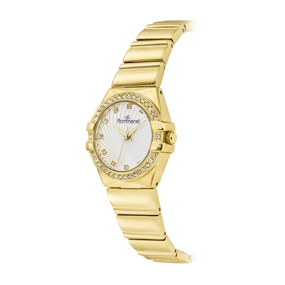Relógio analógico social dourado, caixa redonda de metal, mostrador branco com 1 coração, números e ponteiros dourados, vidro mineral, pulseira de aço, fecho trava de pressão, resistente a água.