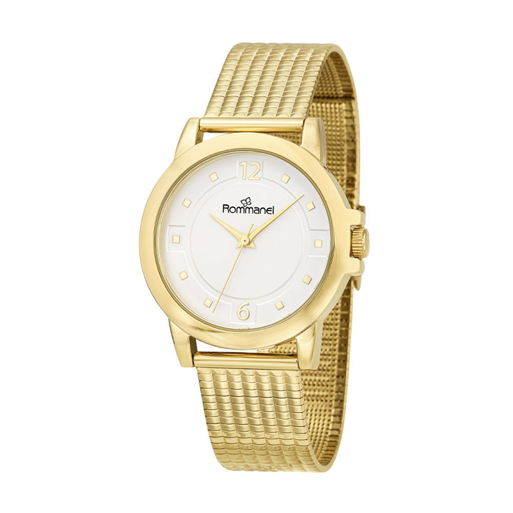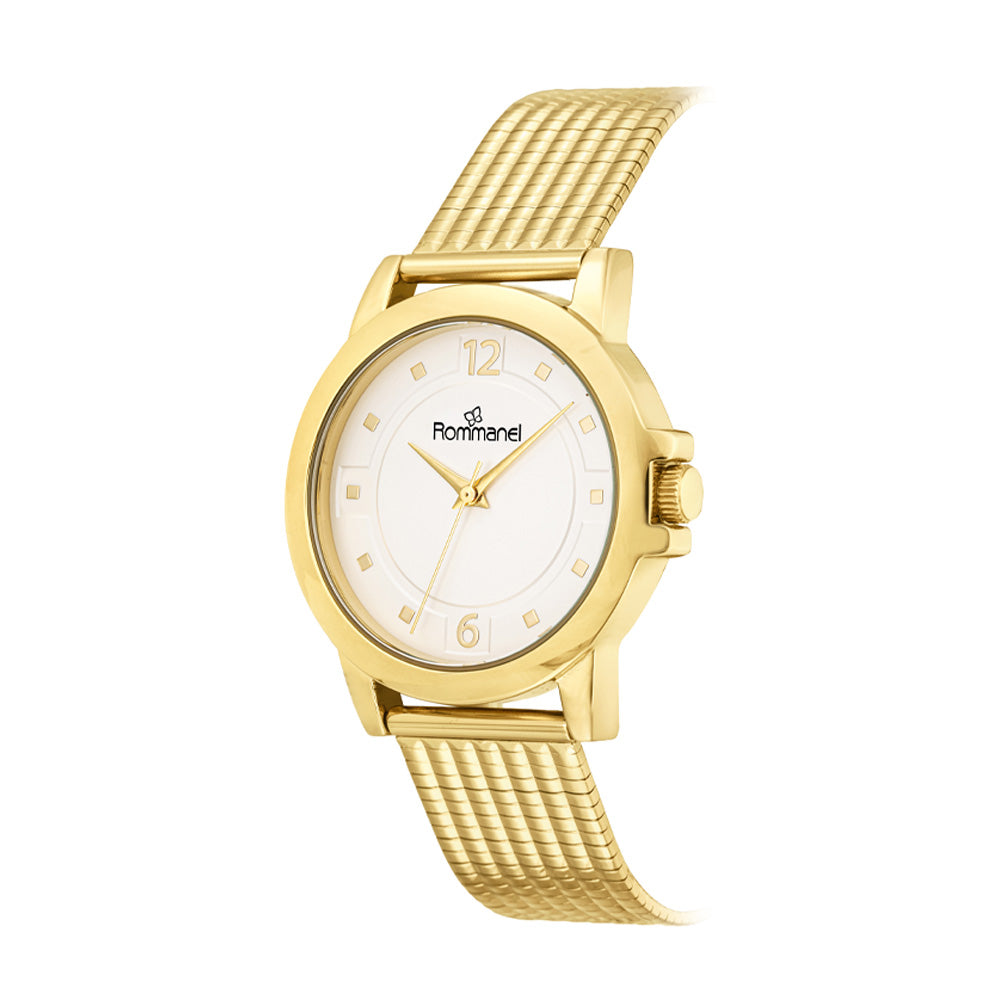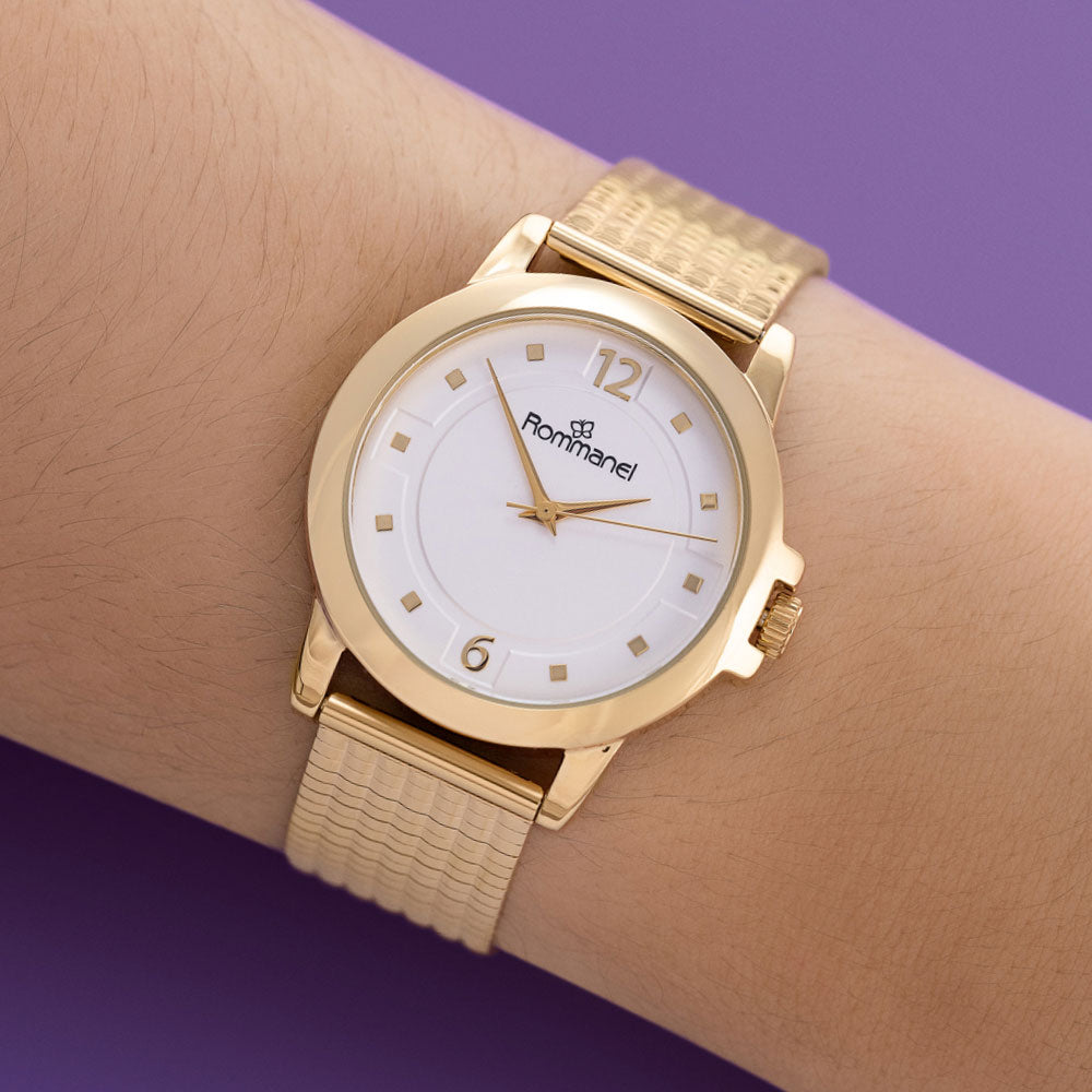 Relógio analógico social dourado, caixa redonda de metal, mostrador branco, números e ponteiros dourados, vidro mineral, pulseira de aço, fecho slide com trava de pressão, resistente a água.