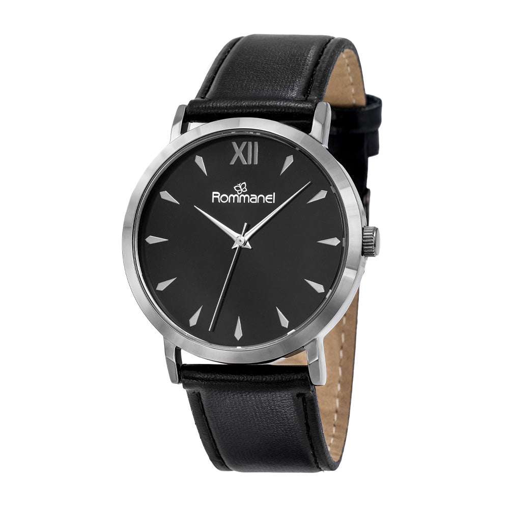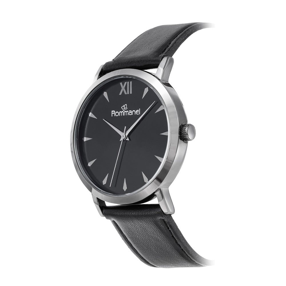 Relógio analógico social grafite com preto, caixa redonda de metal grafite, mostrador preto,número romano e ponteiros cinza, vidro mineral, pulseira de couro sintético preto, fecho fivela, resistente a água.