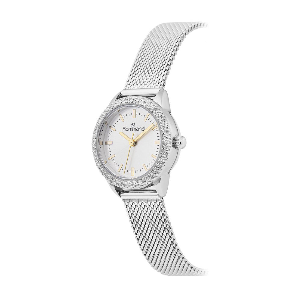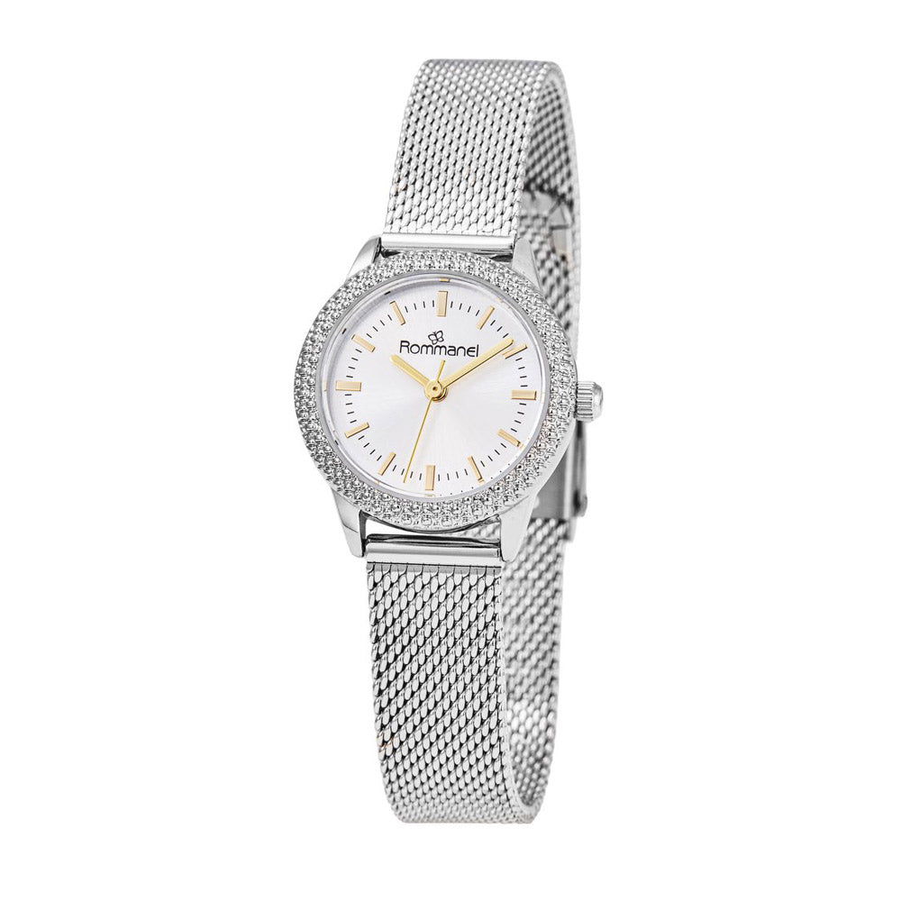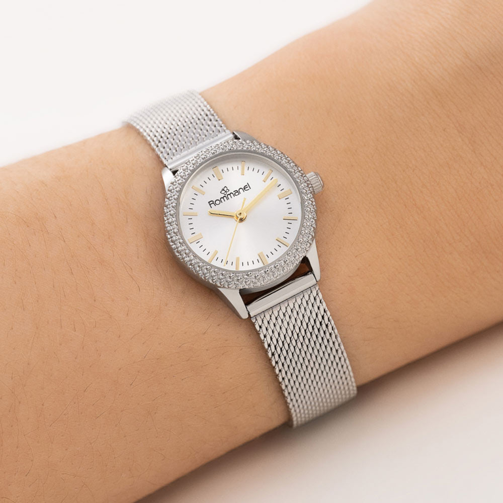 Relógio analógico social prata, caixa redonda de metal, mostrador cinza metálico, ponteiros dourados, vidro mineral, pulseira de aço, fecho slide com trava de pressão, resistente a água.