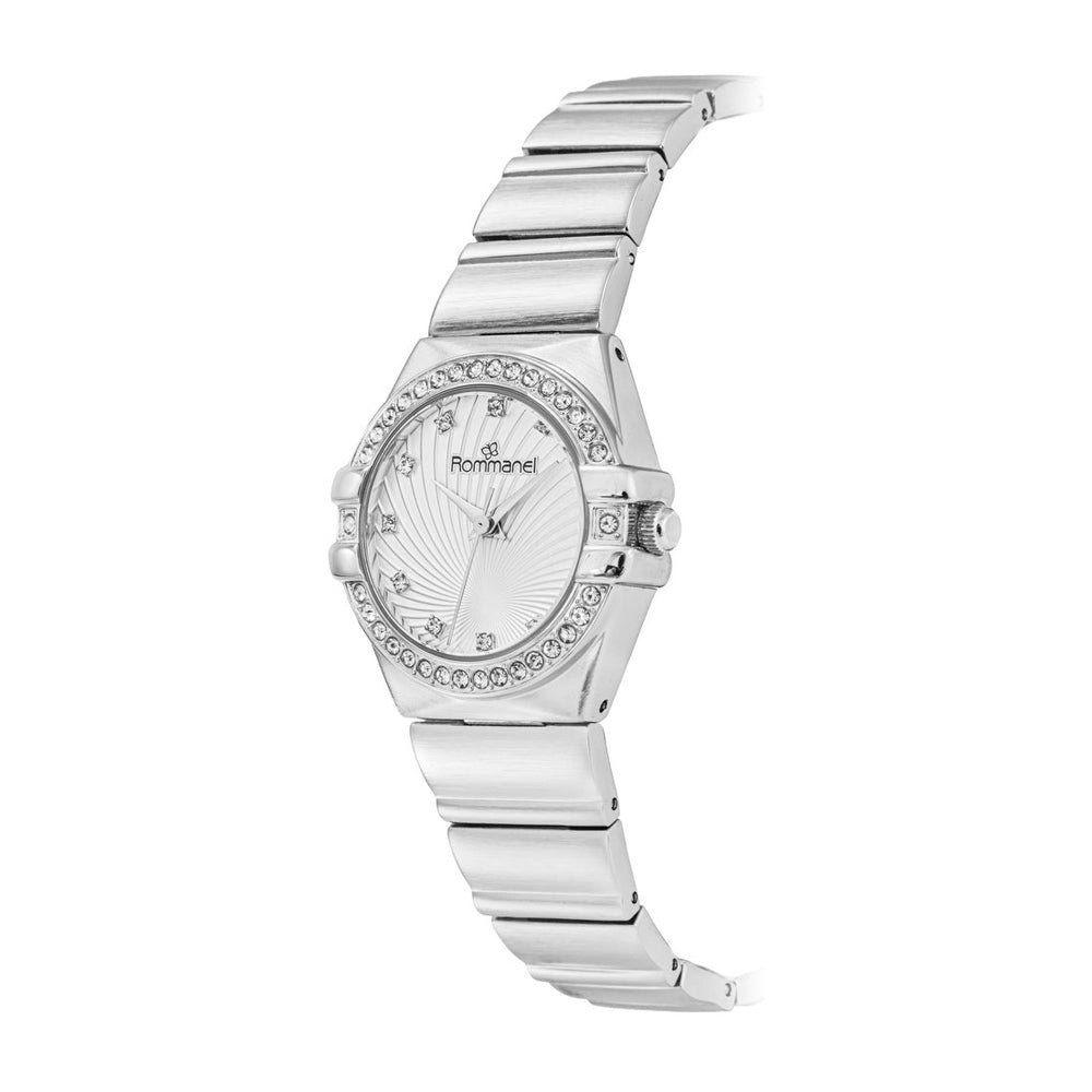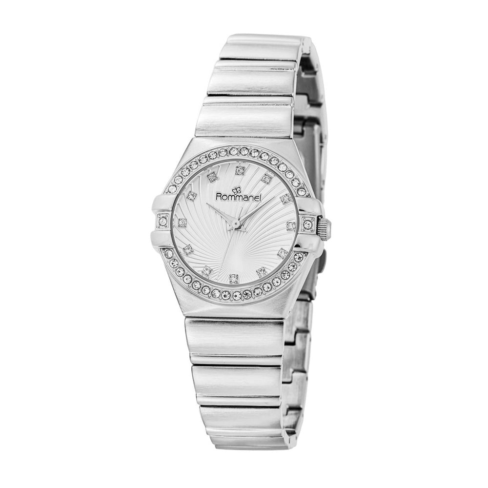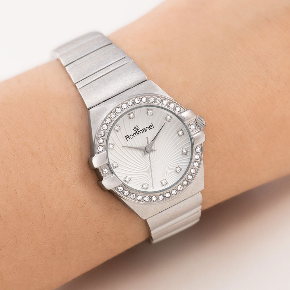 elógio analógico social prata, caixa redonda de metal com 34 cristais, mostrador branco texturizado com 12 cristais, vidro mineral, pulseira de metal, fecho trava de pressão, resistente a água.