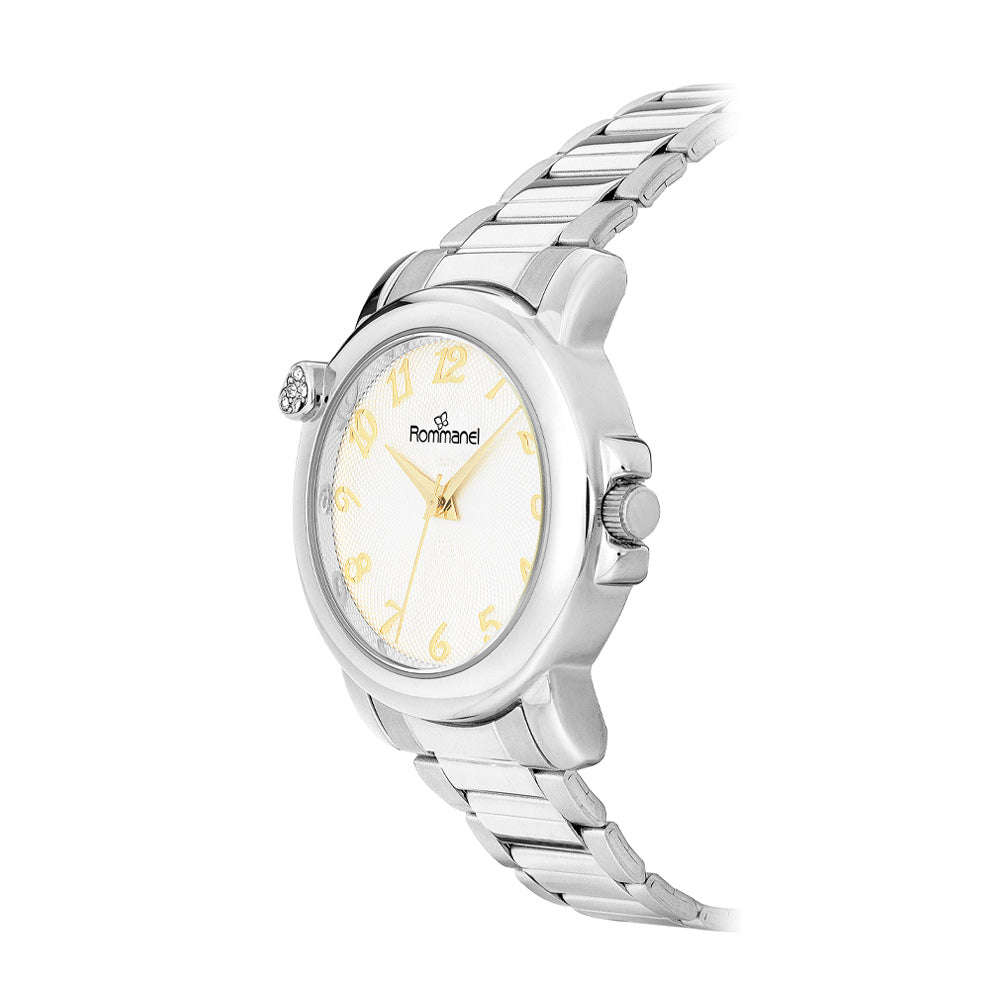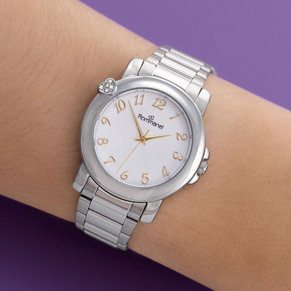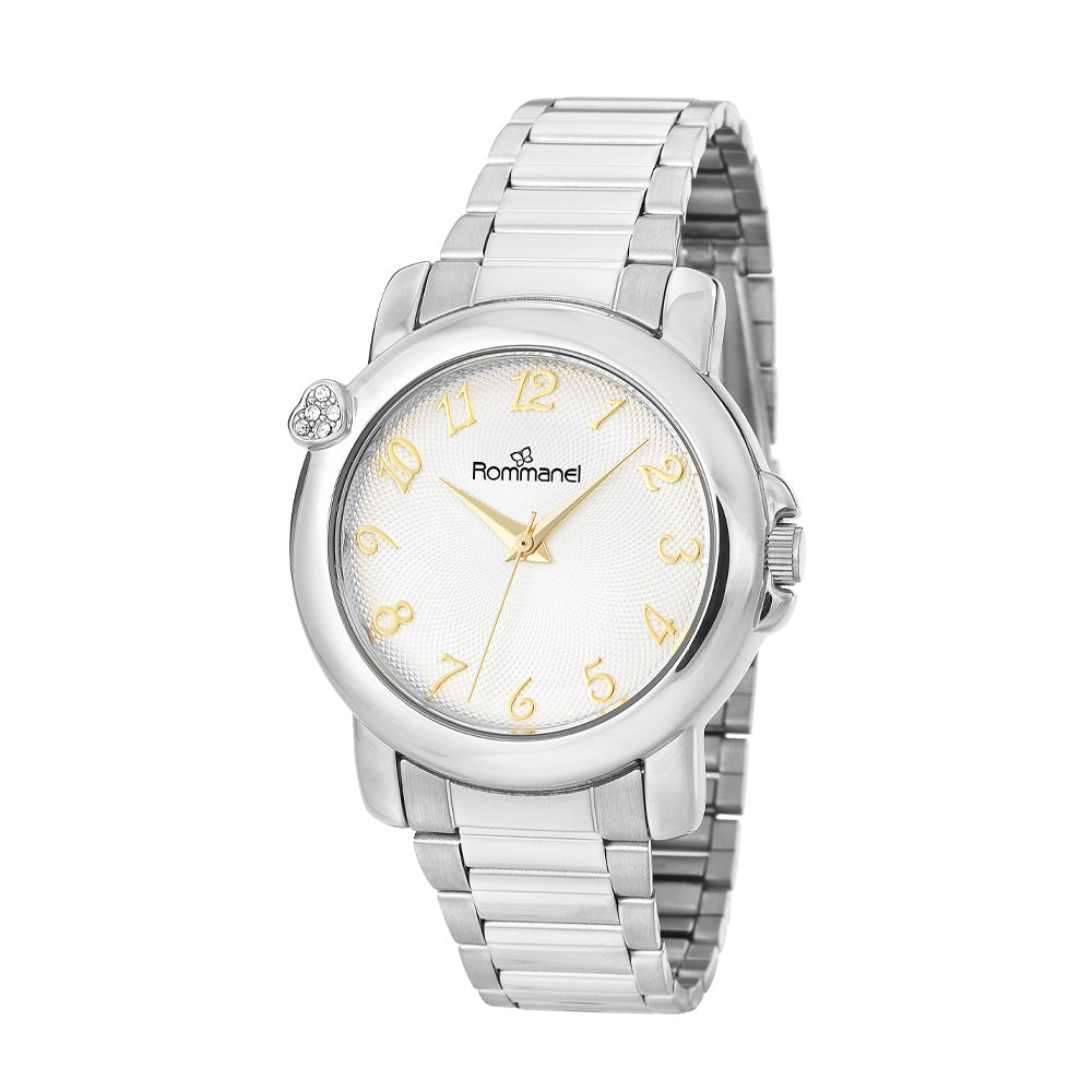 Relógio analógico social prata, caixa redonda de metal com 1 coração cravejado por 5 cristais , mostrador branco texturizado, números e ponteiros dourados, vidro mineral, pulseira de aço, fecho trava, resistente a água.