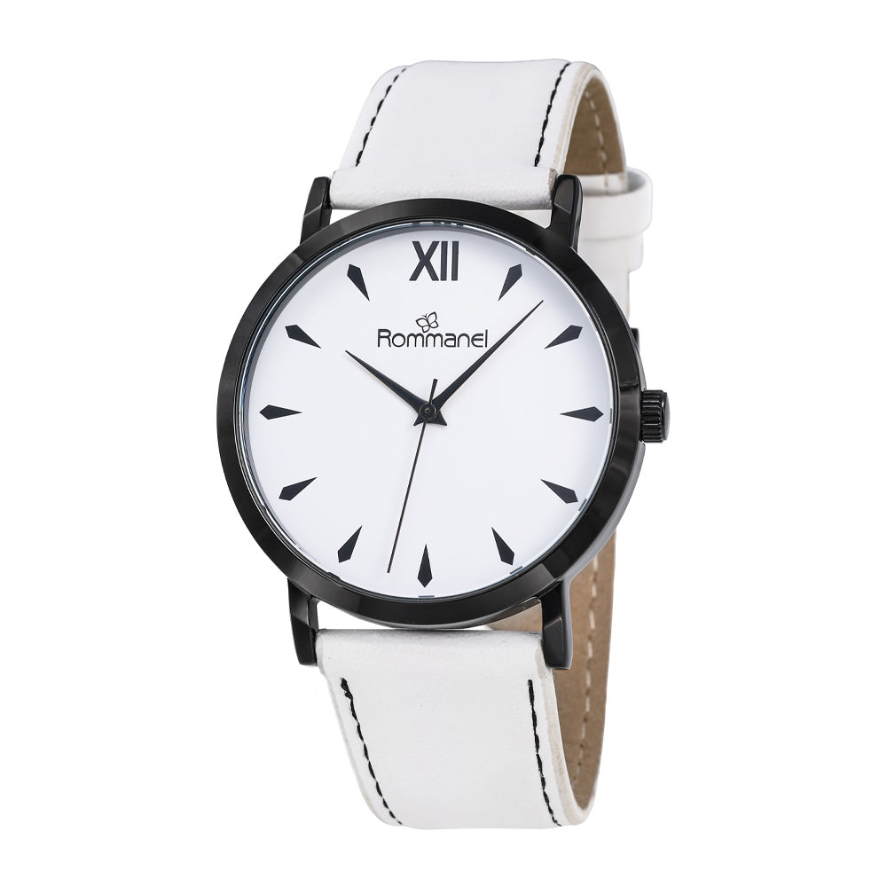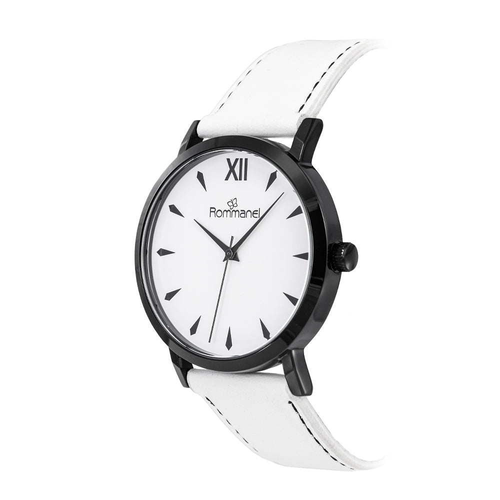 Relógio analógico social preto com branco, caixa redonda de metal cromo negro, mostrador branco,número romano e ponteiros preto, vidro mineral, pulseira de couro sintético branco, fecho fivela, resistente a água.