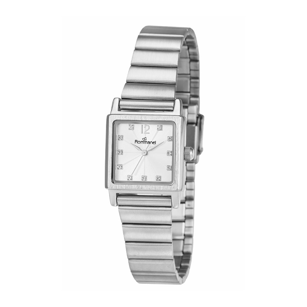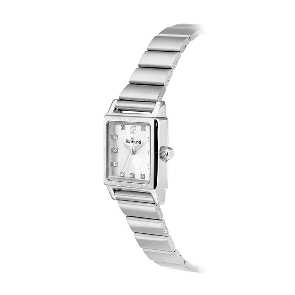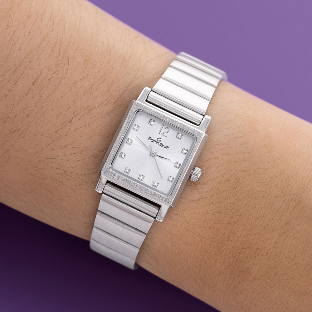 Relógio analógico social prata, caixa quadrada de metal, mostrador cinza metálico com 11 cristais, número e ponteiros cinza, vidro mineral, pulseira de aço, fecho slide com trava de pressão, resistente a água.
