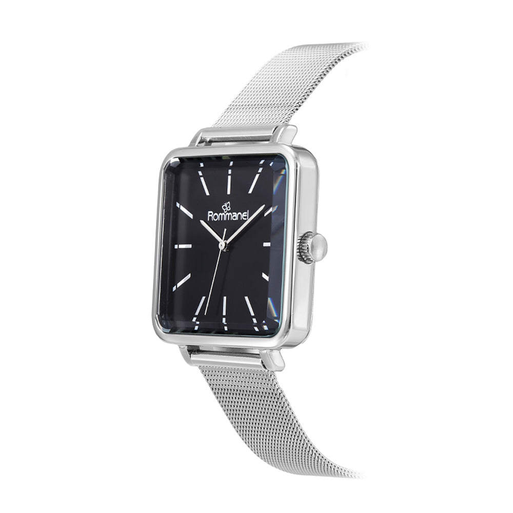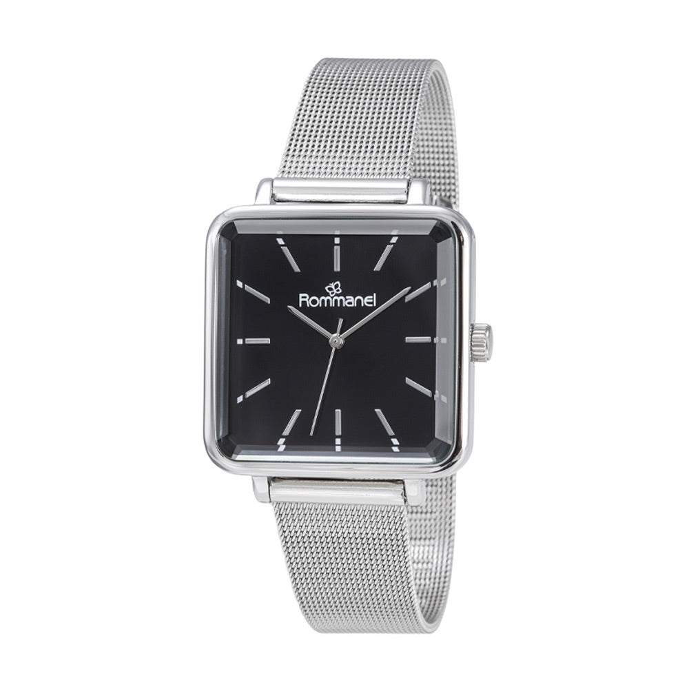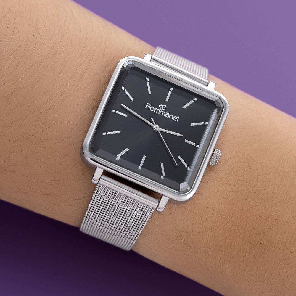 Relógio analógico social prata, caixa quadrada de metal, mostrador preto, ponteiros cinza, vidro mineral, pulseira de aço, fecho slide com trava de pressão, resistente a água.