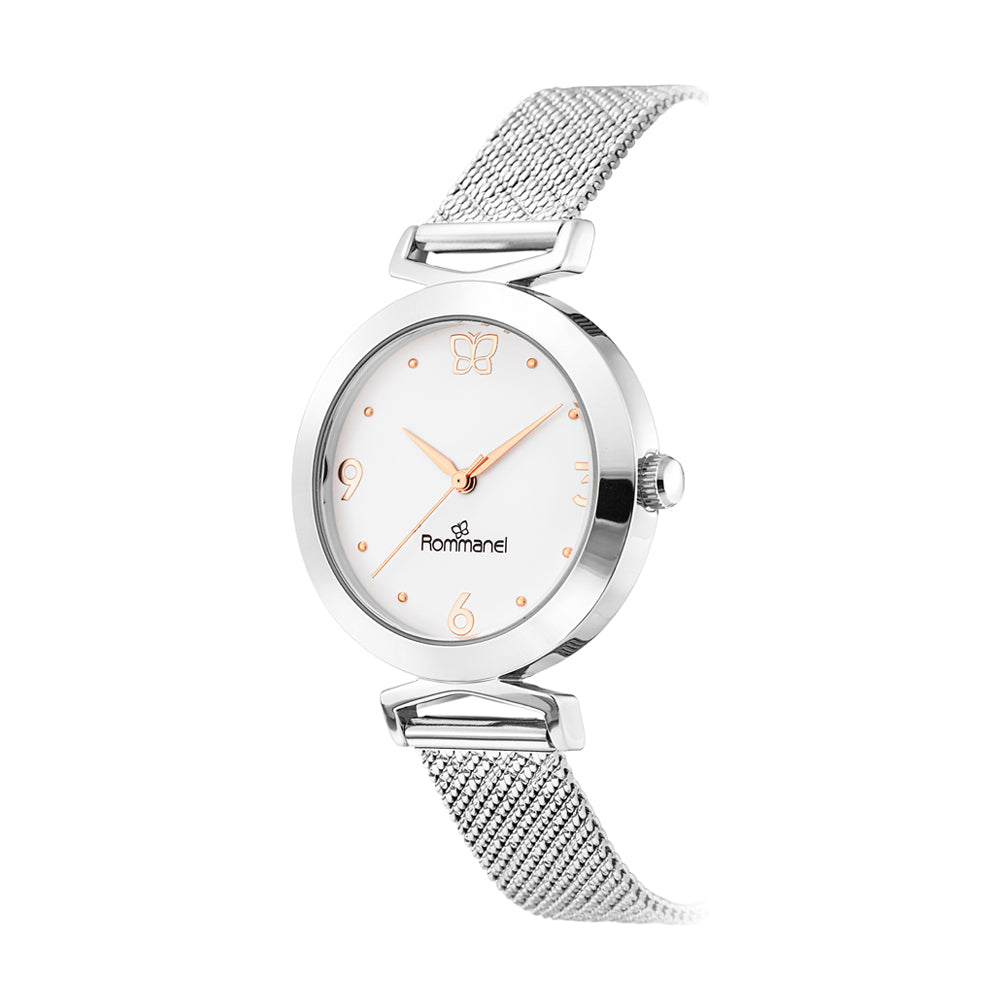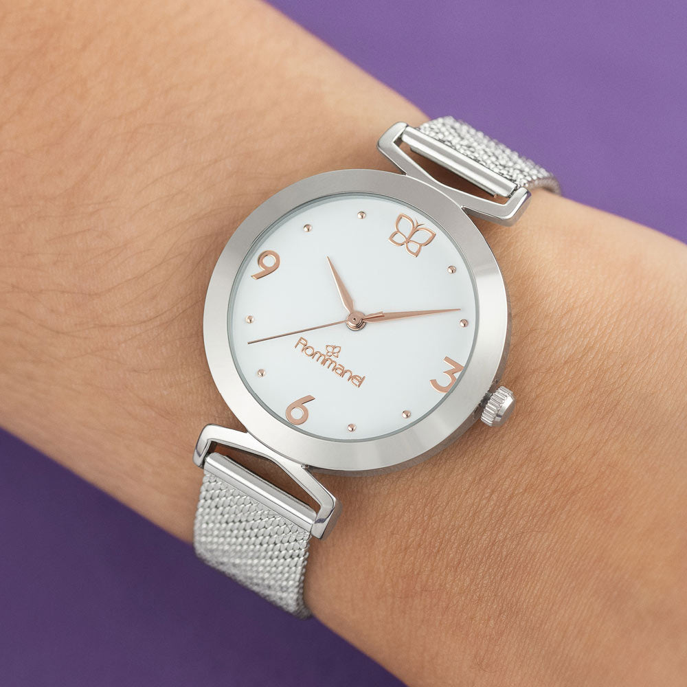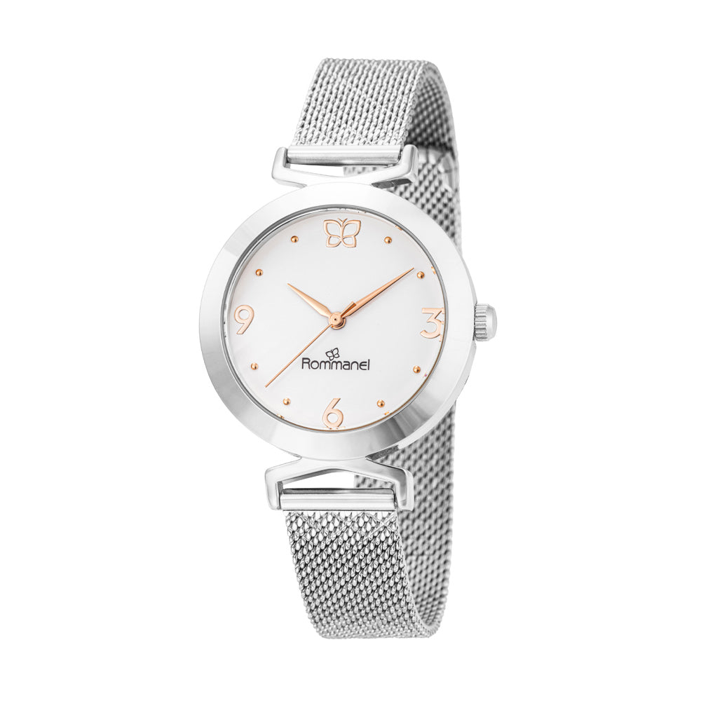 Relógio analógico social prata , caixa redonda de metal, mostrador branco com 1 borboleta, números e ponteiros rose, vidro mineral, pulseira de aço, fecho slide com trava de pressão, resistente a água.