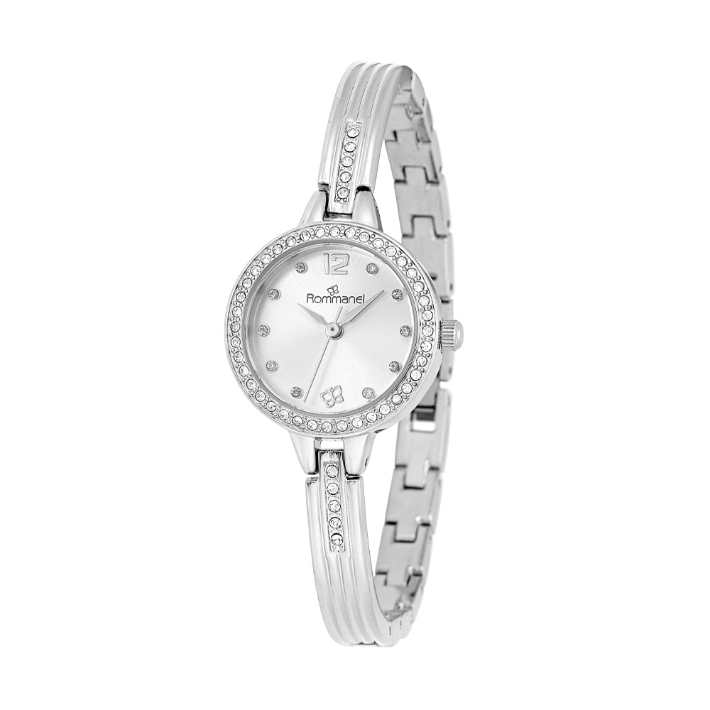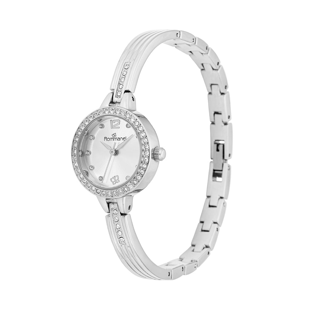 Relógio analógico social prata , caixa redonda de metal com 40 cristais, mostrador cinza metálico com 10 cristais, números e ponteiros prata, vidro mineral e pulseira bracelete de metal com 10 cristais, resistente a água.