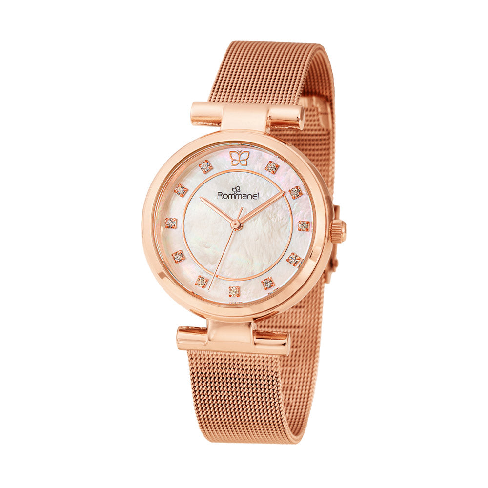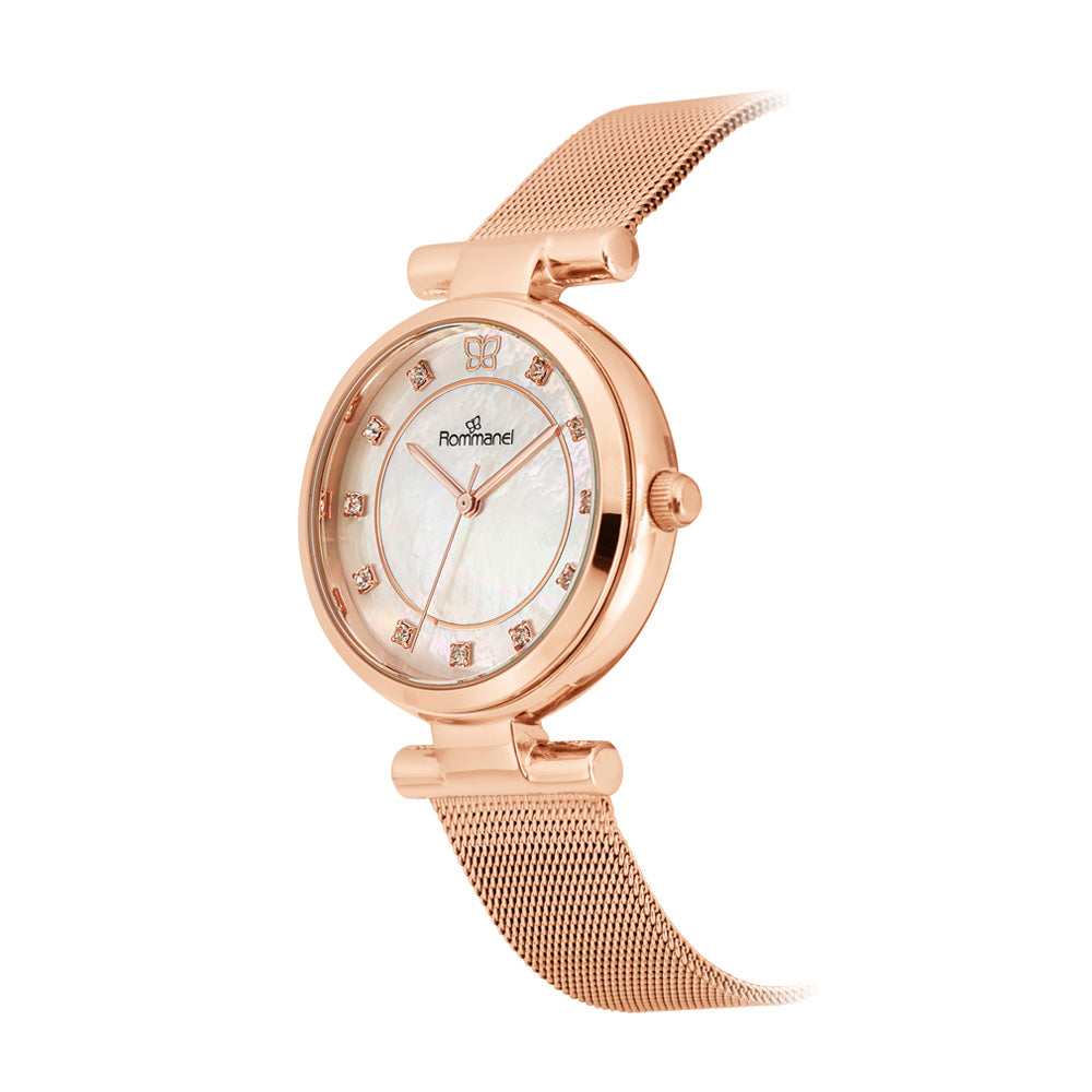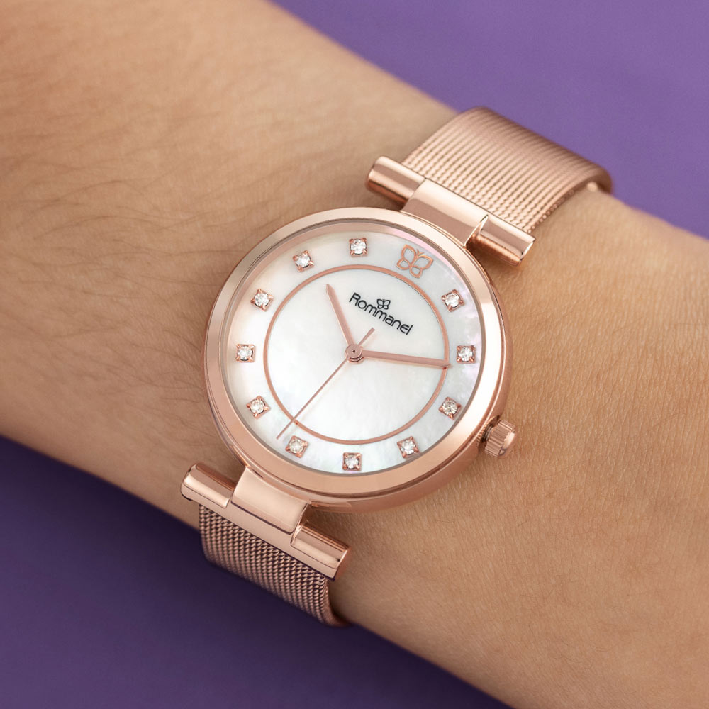 Relógio analógico social rose, caixa redonda de metal, mostrador cor inspirado na madrepérola com 11 cristais, ponteiros rose, vidro mineral, pulseira de aço, fecho slide com trava de pressão, resistente a água.