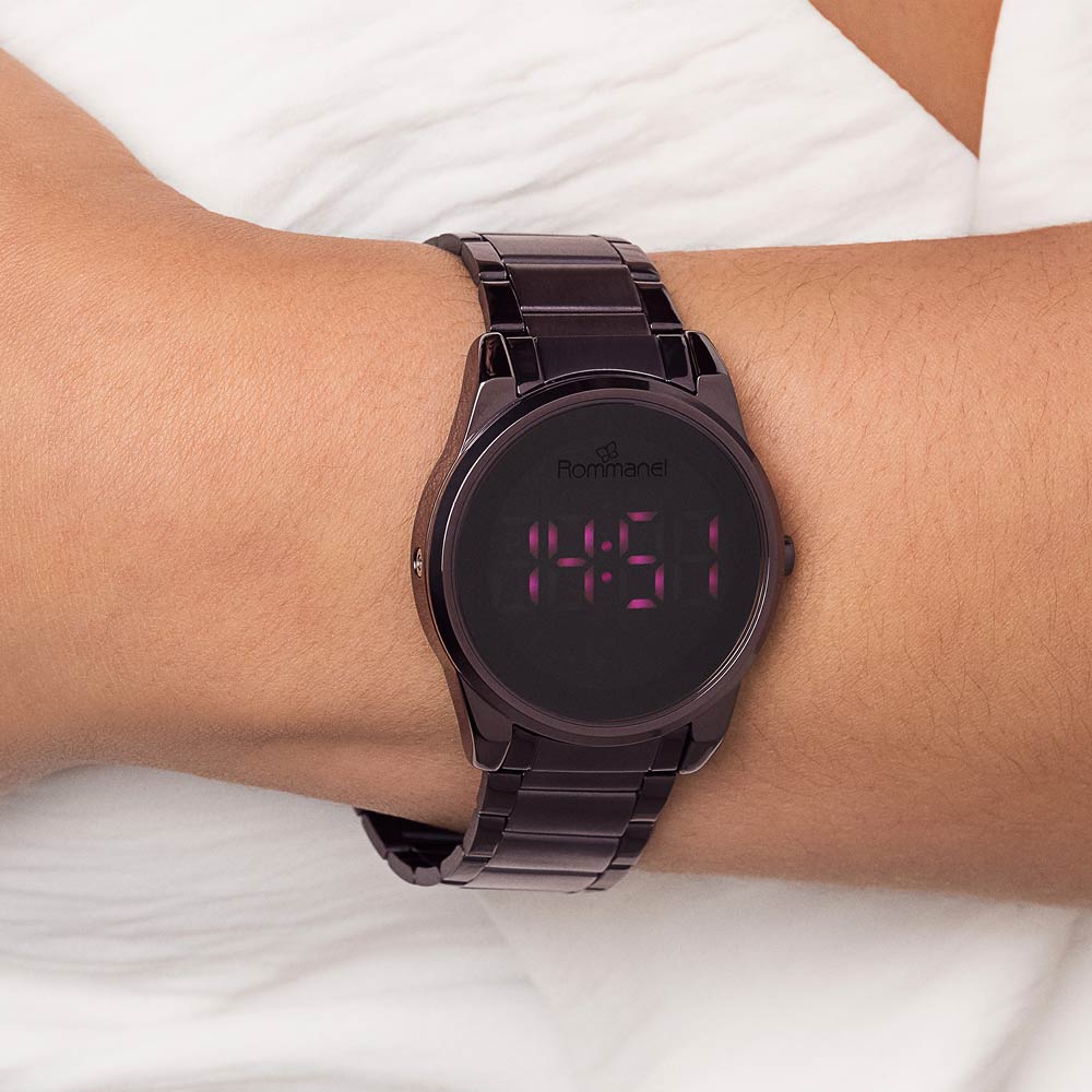 Relógio digital led roxo, caixa redonda de metal, mostrador cinza espelhado, números lilás, vidro mineral e pulseira de aço com fecho de pressão, resistente a água.